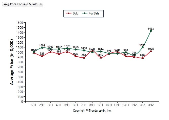 The green line shows the average list price of all homes on the market in San Carlos. Part of the steep uptick in March can be attributed to a few high profile listings that hit the market north of $2M. The red line reflects the average closed prices of homes that sold in San Carlos. Even throughout the spring surge of last year, prices stayed relatively flat. Only in the March 2012 data are we seeing a significant uptick in prices… but one month does not a trend make, so it will be interesting to watch this graph in the coming months.