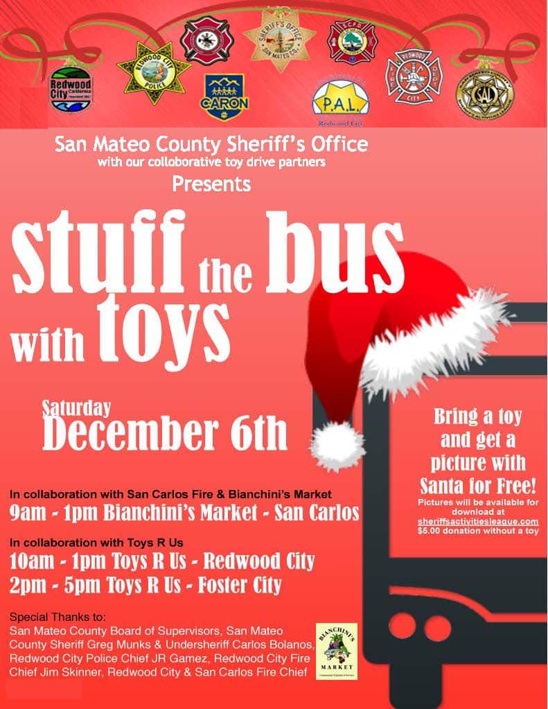 Join the San Mateo County Sheriff's Department this coming Saturday December 6 for their annual “Stuff the Bus” holiday toy drive, which helps shed some cheer on those who are less fortunate this holiday season. The Sheriff's Department community outreach organizations, with help from the Redwood City and San Carlos Fire Departments, Bianchini's Market, and Toy's R Us, will be at various locations throughout the mid-Peninsula on Saturday to collect toys and cash donations in lieu of toys. In addition, there are dozens of collection barrels located throughout the area that will be available all month for people to drop off unwrapped toys and books.