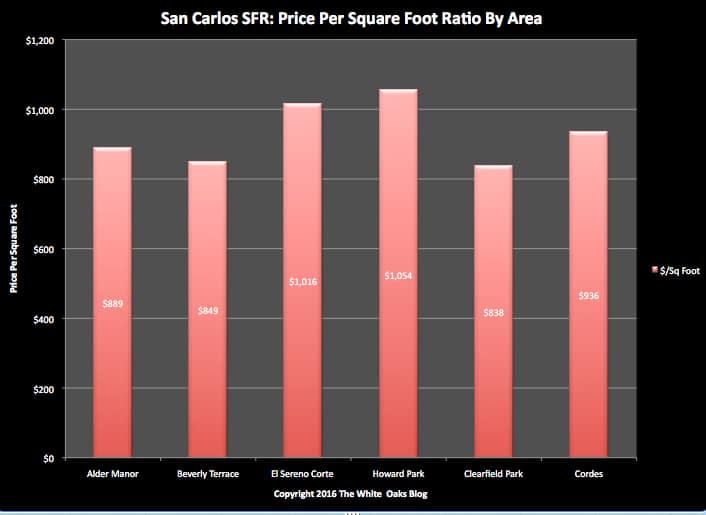 So far in 2016, Howard Park has registered an eye-popping average of $1,054 per square foot for all homes sold, followed closely by El Sereno Corte at $1,016. Both of these are absolutely stunning averages, considering that $600/square foot used to be a number only achieved by brand new construction. The aforementioned 2010 post shows that price per square foot figures have increased by almost 75% in San Carlos since 2010!