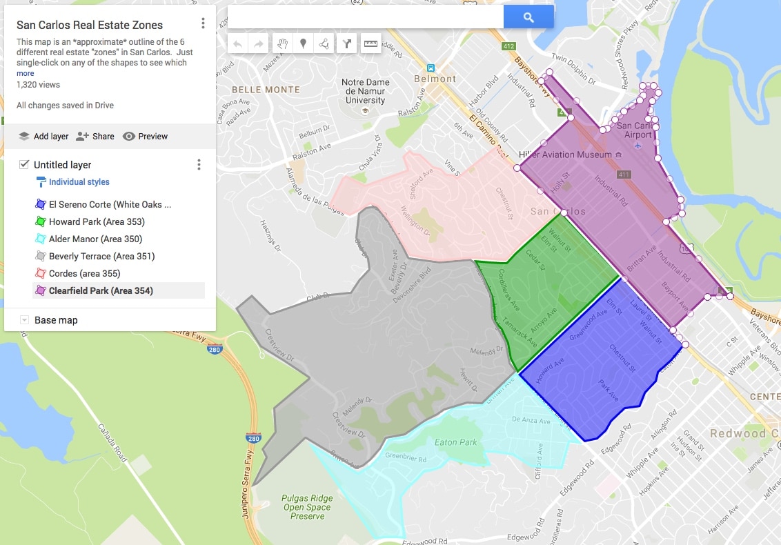 For those of you that are not familiar with the various neighborhoods of San Carlos, you can click on the San Carlos Realtor Zone Page or use the map below as a reference. Note that “El Sereno Corte” is comprised of both the White Oaks and Oak Park neighborhoods – they are not split out independently in the MLS data.