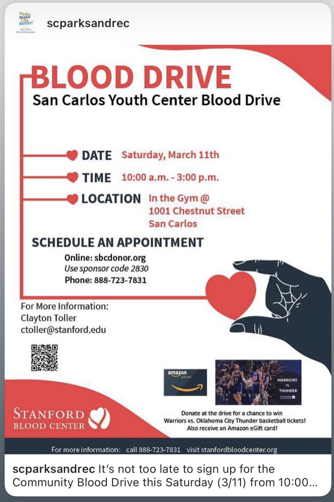 The Stanford Blood Center, in conjunction with the San Carlos Park and Rec Department, is conducting a blood drive this coming Saturday 3/11 at the San Carlos Youth Center from 10AM – 3PM. I'm happy to be able to help publicize this event because the Stanford Blood Center is an organization that is very near and dear to me.