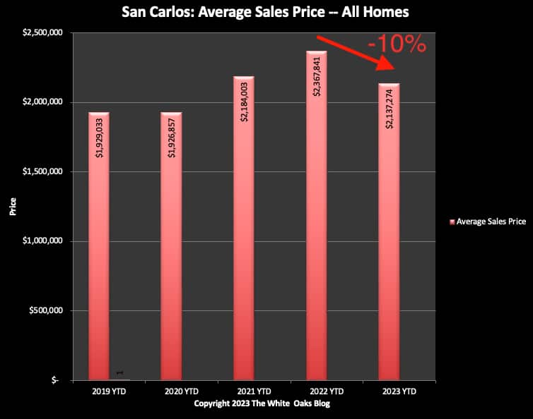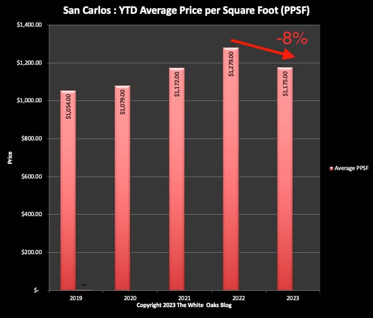 Compare this to the San Carlos condo market, which only dropped by 2.3% this year in average sales price, and the average price per square foot only dipped 3.4%. If you've followed the San Carlos real estate market for any period of time, you know that this is the inverse of the normal behavior when the market hits a snag; usually condos and townhomes suffer more dramatic price drops than single-family homes. But in 2023, nothing is normal.