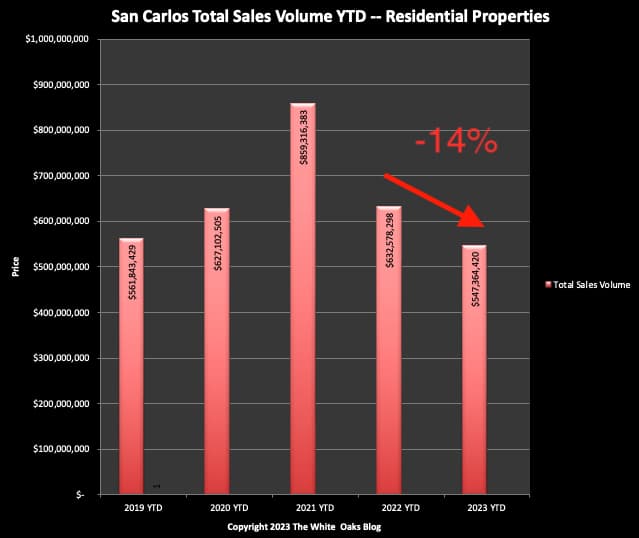The graph below shows the total sales revenue for all residential properties sold in San Carlos this year — single family homes and condos. Much like the last update, the total for 2023 is significantly behind the same period in the previous 5 years.