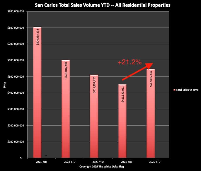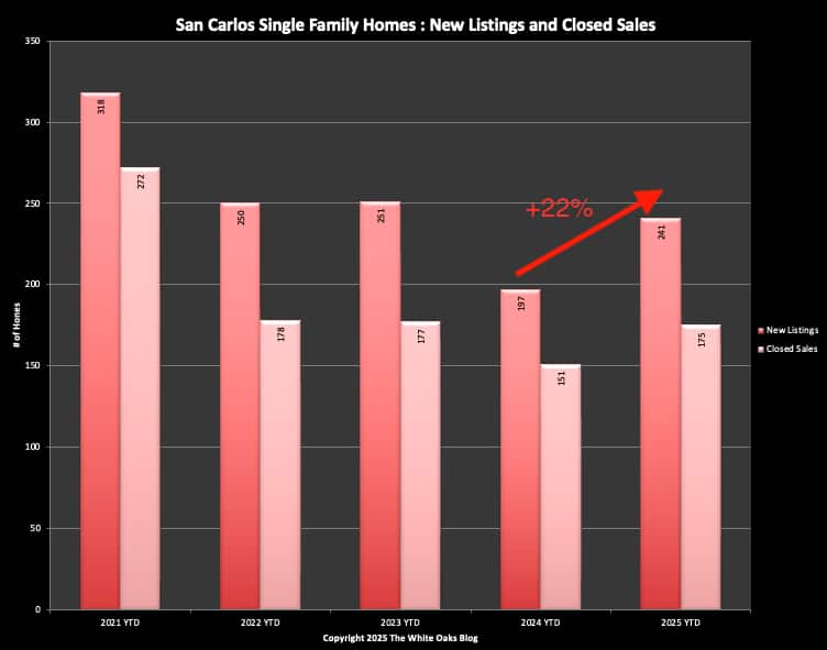 The good news in the data below is that the residential real estate market in San Carlos in 2025 is significantly outperforming the market during the same period in 2024.