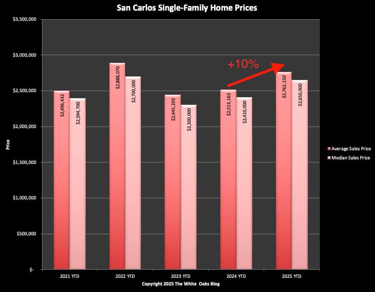 But what's not as obvious is that when I run these numbers again at the end of the year and compare full-year data between the years, 2025 will likely supplant 2022 as the record holder for all-time pricing in San Carlos. That's because after the market peaked in the first half of 2022, the rapid increase in home mortgage interest rates that started in March of 2022 seriously eroded home prices in 2022 and 2023. It's only now that home prices have recovered from the shock effect of 11 interest rate increases over just 16 months.