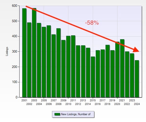 This chart shows the number of new single-family home listings (not sales) in San Carlos each year since 2001. Except for a brief blip immediately after COVID, when interest rates were at all-time lows, the trend has been steadily downward since the early 2000s, resulting in a 58% decline from the peak in 2003.