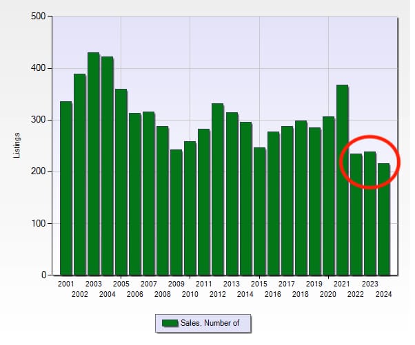 As I have mentioned numerous times on this site, the number of single-family homes that were sold across the country in 2024 was the lowest level in nearly 30 years, according to the National Association of Realtors (NAR). The 216 homes that sold in San Carlos last year mirrored the national data and were the lowest level in at least 25 years. The MLS data only goes back to 2001, so I suspect it was a lot longer than 30 years ago when the numbers were this low in San Carlos.