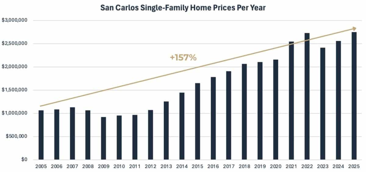 The average price of a single-family home in San Carlos grew from about $1.07M in 2005 to $2.75M in 2025. That’s an increase of nearly $1.68M, or 157%. So even after the $250,000 or $500,000 exemption is taken into account, many long-time homeowners in San Carlos are sitting on at least $1,000,000 in taxable profit when they sell their home.